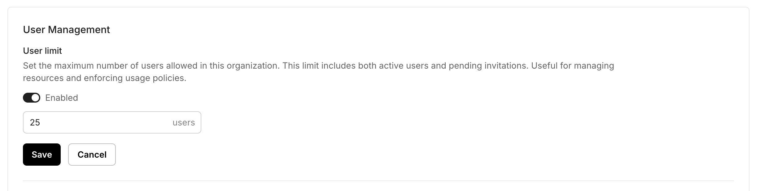 Define the maximum number of organizations a single user can create. This helps prevent abuse and manage resource usage across your application.