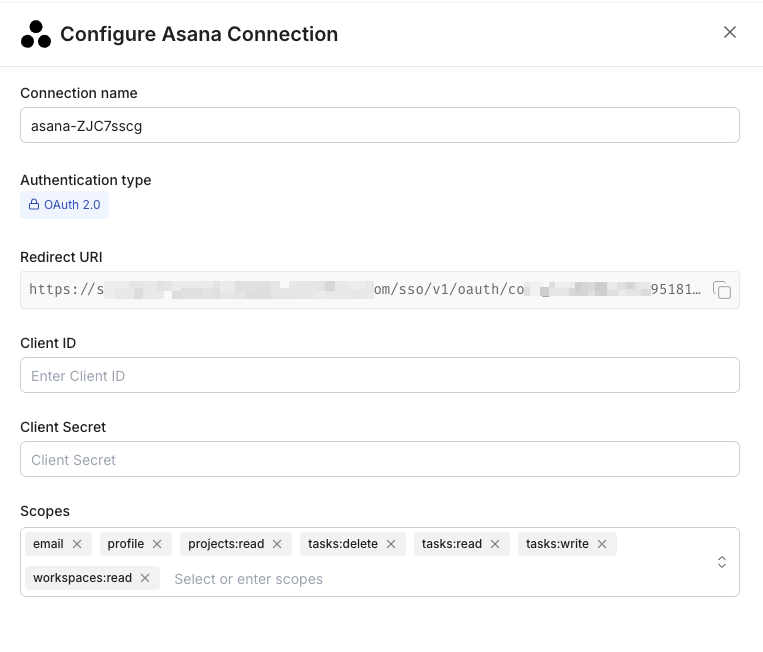 Section titled “Set up the agent connector”Register your Scalekit environment with the Asana connector so Scalekit handles the authentication flow and token lifecycle for you. The connection name you create will be used to identify and invoke the connection programmatically. Then complete the configuration in your application as follows:
