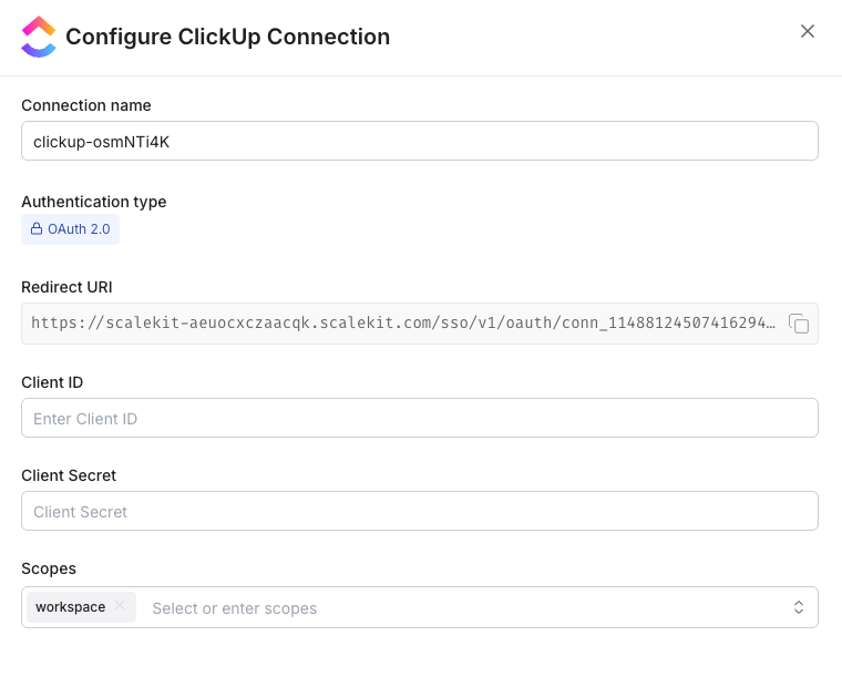 Section titled “Set up the agent connector”Register your Scalekit environment with the ClickUp connector so Scalekit handles the authentication flow and token lifecycle for you. The connection name you create will be used to identify and invoke the connection programmatically. You’ll need your app credentials from the ClickUp API settings in your workspace.