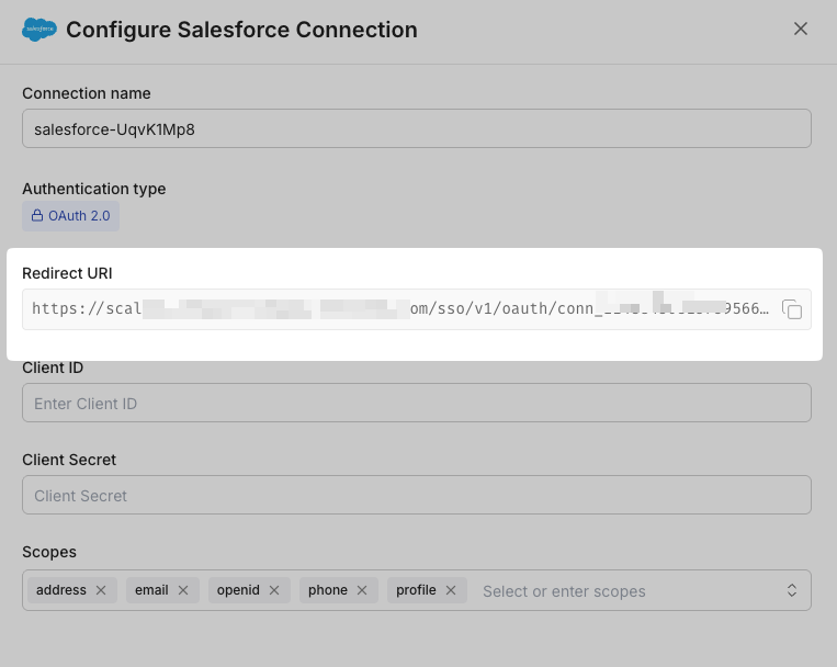- Permissions (scopes — see Salesforce OAuth Scopes documentation)