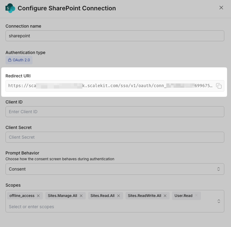 Register your Scalekit environment with the SharePoint connector so Scalekit handles the authentication flow and token lifecycle for you. The connection name you create will be used to identify and invoke the connection programmatically. Then complete the configuration in your application as follows: